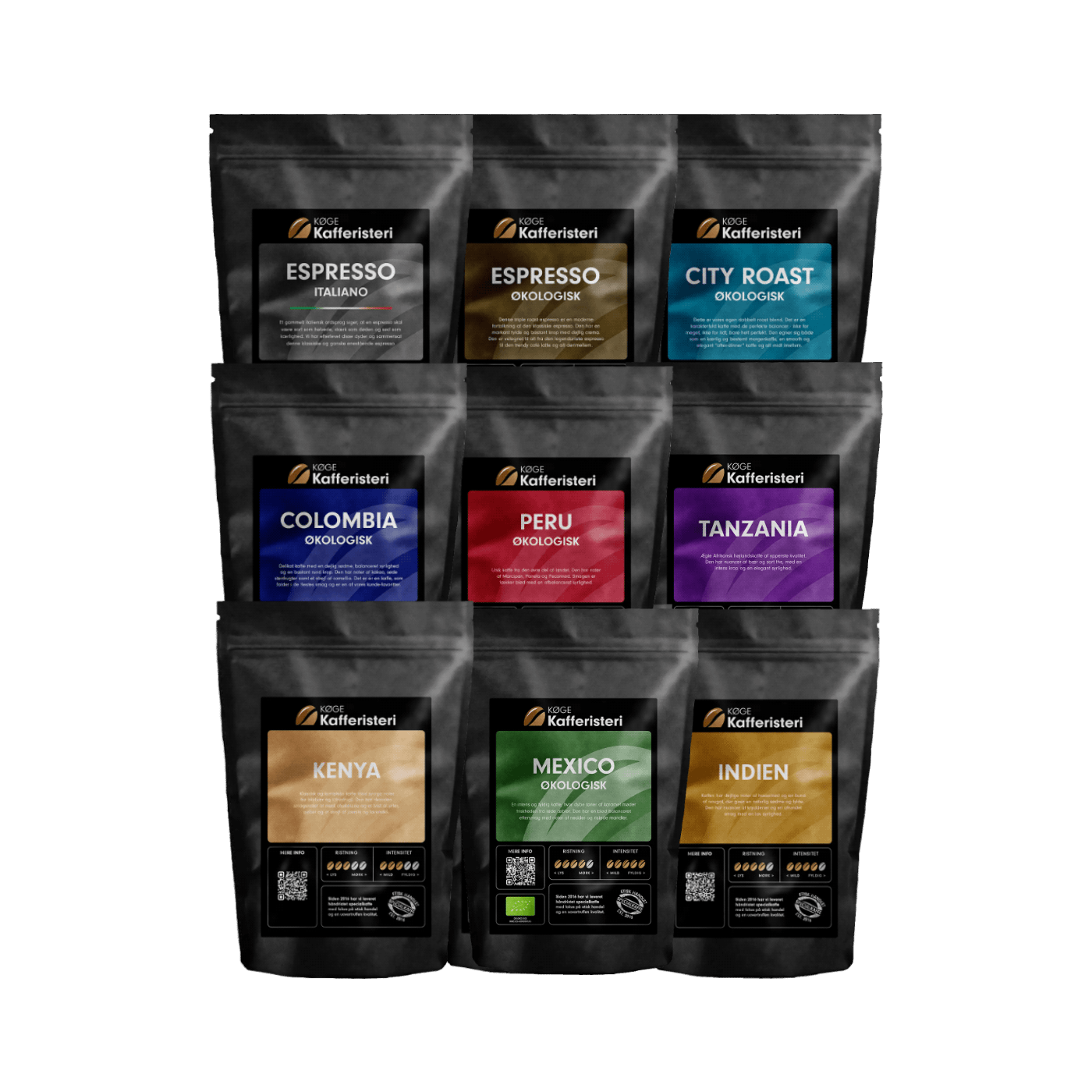 Denne smagspakke indeholder 9 forskellige varianter og er sammensat af et bredt udvalg af vores forskellige kaffer. Her er alt fra den lysristede med nuancer af blomster, krydderier og en frisk syrlighed til den bastante mørke kaffe, som gør sig til en perfekt after-dinner kaffe og alle kaffer derimellem.